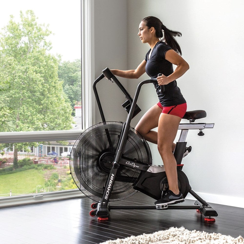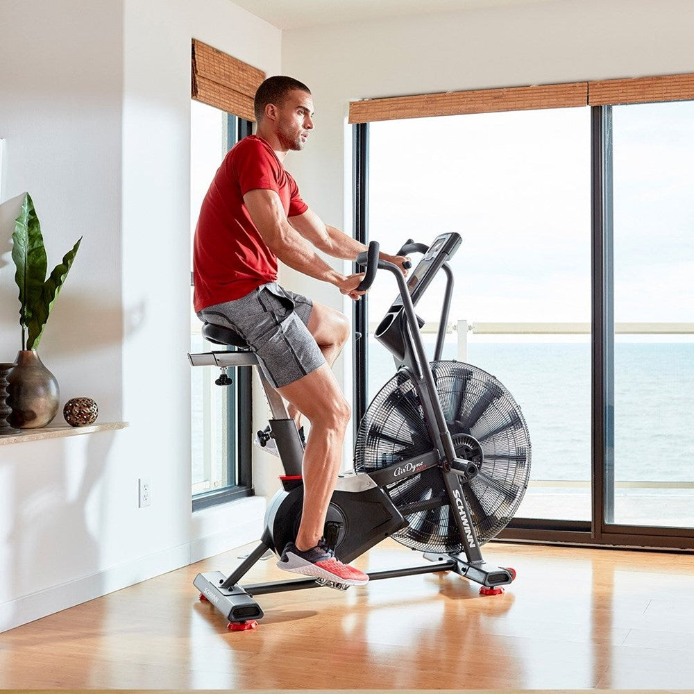 Schwinn AD8 AirDyne The new Schwinn AD8 Airdyne bike leverages the iconic Schwinn air resistance and updates it with a slick design for modern the fitness environment. As a result, your outcome is durability and performance in one piece of slick gym equipment. Whether you use it to bring your workouts to a whole new level at your local box or require the perfect total body cardio workout machine for your home; the AD8 delivers the latest in air resistance technology for effective and efficient workouts. Is it the best assault bike out there? Our head trainer, Simon Mitchell breaks that down for you in this review here. Features: – Resistance levels: Infinite. – Resistance System: Air. – Drive System: Single-Stage Belt Drive. – Style: Upright. – Power Requirements: Two D batteries (not included) AC adapter ready. – Seat: Fore/aft adjustments. – Water Bottle Holder: Yes. – Air Diverter is now included – Specifically designed to block the rush of air generated by the bike’s wheel movement, so you can crank out the miles without wind blowing in your face. Iconic Schwinn invented Airdyne technology, built its legacy around the power of unlimited wind resistance and has continued to refine the technology to stand out among its peers. Durable The Schwinn AD8 is built to stand the test of time as well as the rigors of high intensity training. From the performance engineered, perimeter-weighted flywheel for smooth startup and cycling, to the proven strength of the splined solid steel cranks that deliver more power to the pedals, to the moisture repellent double coated steel body construction, the Schwinn AD8 can outlast even the most intense athlete! Comfortable The Schwinn Airdyne AD8 takes your comfort seriously. It features a revolutionary multi-position handle which offers the flexibility to place your hands either vertically or horizontally. To focus on upper body, we’ve developed anti-slip foot platforms for a more robust push off to leverage more power from your workout. The Schwinn AD8 even offers comfort and customization when it comes to the oversize, padded seat. Designed with a universal rail and clamp system, you have the flexibility to add your own custom seat. Challenging With the Schwinn AD8, the challenge is up to you! The more effort you give, the more resistance it delivers as your sweat equity is channeled straight to our whisper quiet direct drive belt system. Schwinn Airdyne technology blends seamlessly with custom interval training programs to offer a uniquely challenging workout with metrics like watts, calories, time, and distance. Or you can choose to go the lower intensity route – a great option for a body going through recovery from an injury or one that just needs a low impact workout, but still wants to ramp up that heart rate. The Schwinn Airdyne AD8 meets you at your level and provides the challenge to keep you coming back for more. Tech Specifications Dimensions: L 106 x W 50 x H 132cm Product Weight: 51kg Carton Dimensions: 141 x 40 x 89cm Carton Weight: 60kg User Max. Weight: 160kg Warranty: Commercial: 1 Year Parts & Labour Domestic: 1 Year Parts & Labour