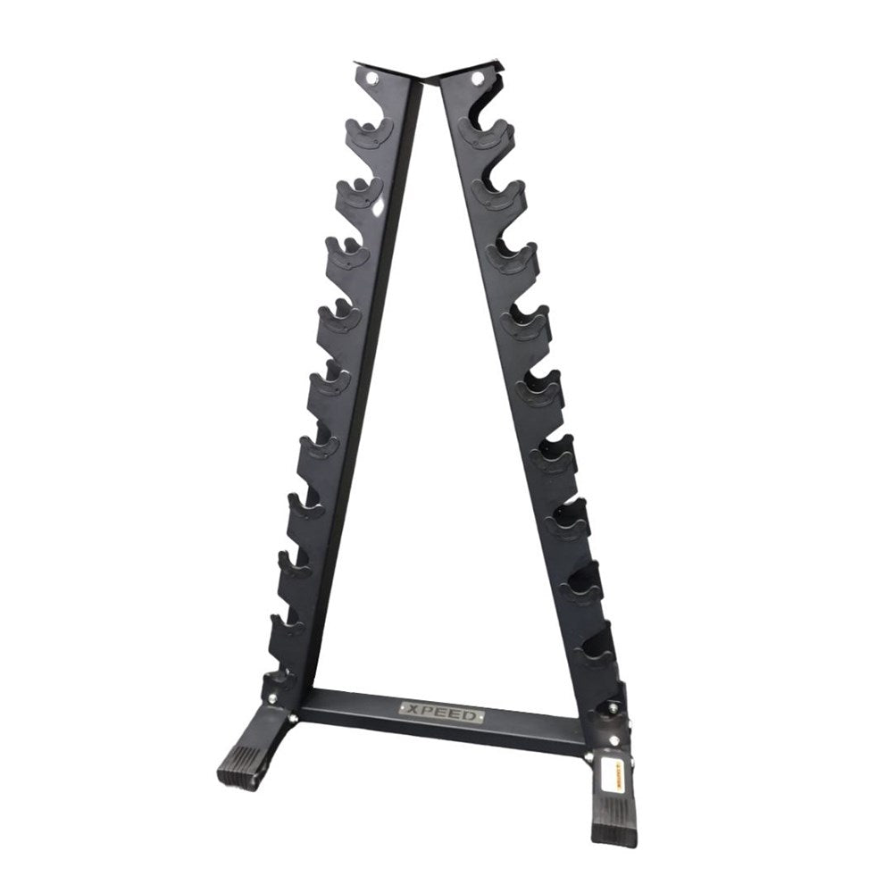 Whether you're a fitness enthusiast or a professional trainer, the Xpeed A-Frame Dumbbell Rack offers the versatility needed for a well-organised workout space. It holds 10 pairs of dumbbells, accommodating  1kg - 10kg pairs. Keep your workout area clutter-free and ensure that your equipment is always within reach.