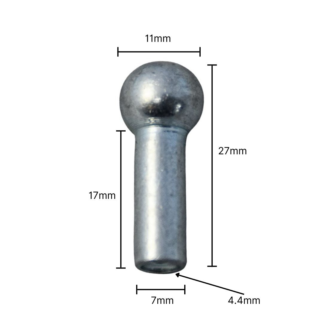 The Cable Attachment Medium Ball Single Crimp features a cable bell end that is not drilled all the way through. This unique design helps prevent the cable from threading, ensuring its longevity and maintaining its effectiveness over time.