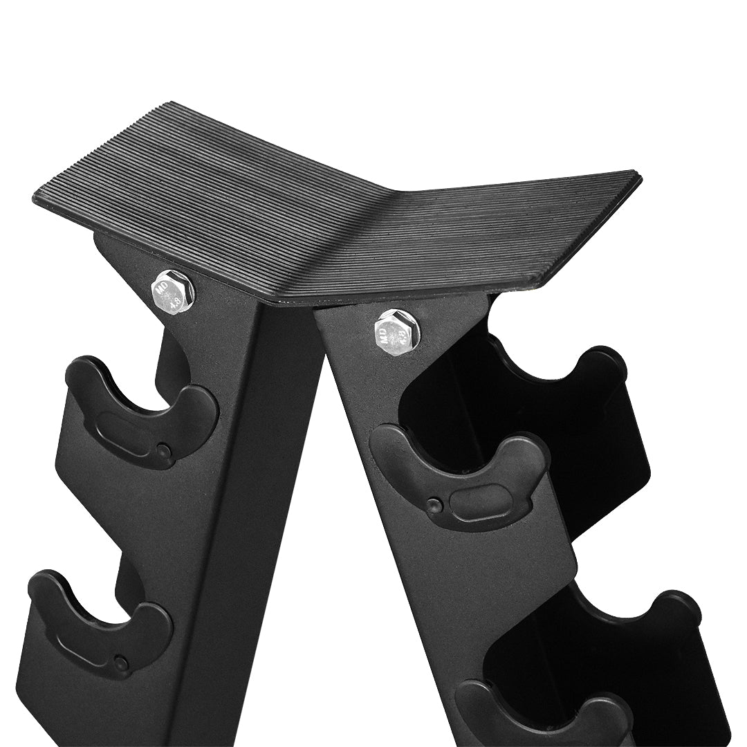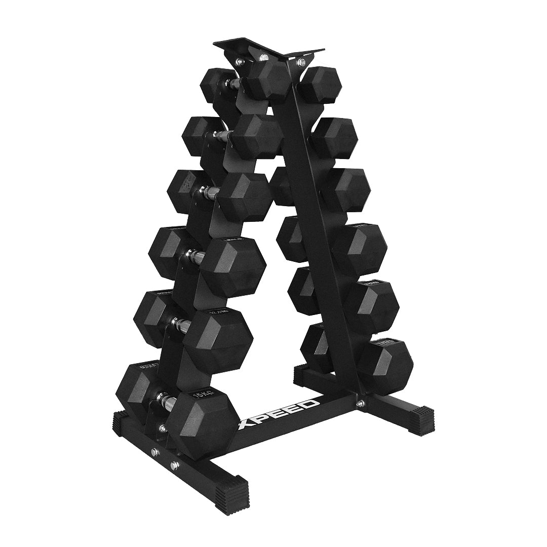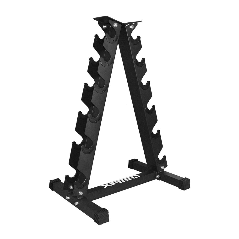 Constructed from high-quality steel, the Xpeed A-Frame Dumbbell Rack is built to last. The robust frame can support up to 6 pairs of dumbbells, ensuring your equipment is safely stored and ready for your next workout. The sleek black powder-coated finish not only looks great but also provides added protection against wear and tear.